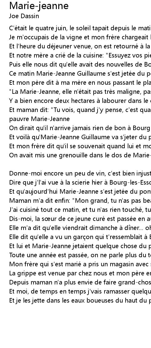 | Et qu' aujourd' hui MarieJeanne s' est jete e du pont de la Garonne" | |