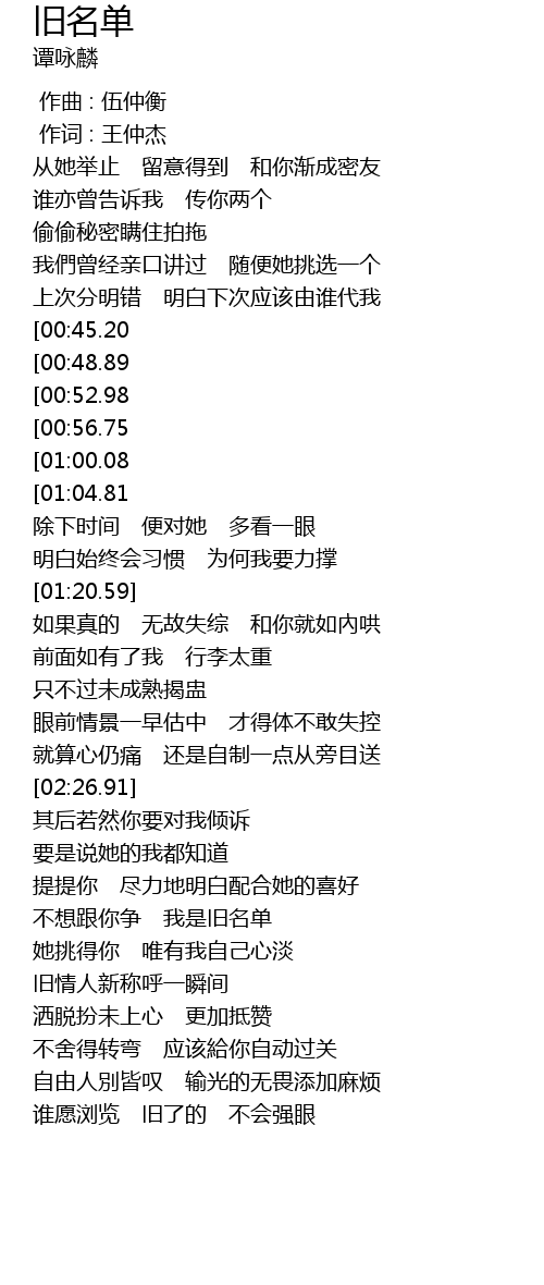 | [01:51.80][00:45.20] | 不想跟你争 胜负旧名单 |