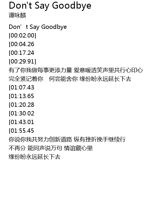 | [02:39.70][01:13.65] | Don't Say Goodbye 浓情冲不淡 没法变 |