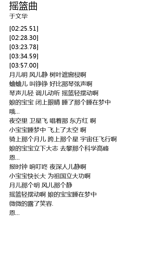 | [03:39.96] | 摇篮轻摆动啊 娘的宝宝睡在梦中 |