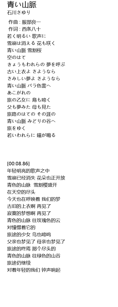 | [01:13.54] | 青い山脈 バラ色雲へ |