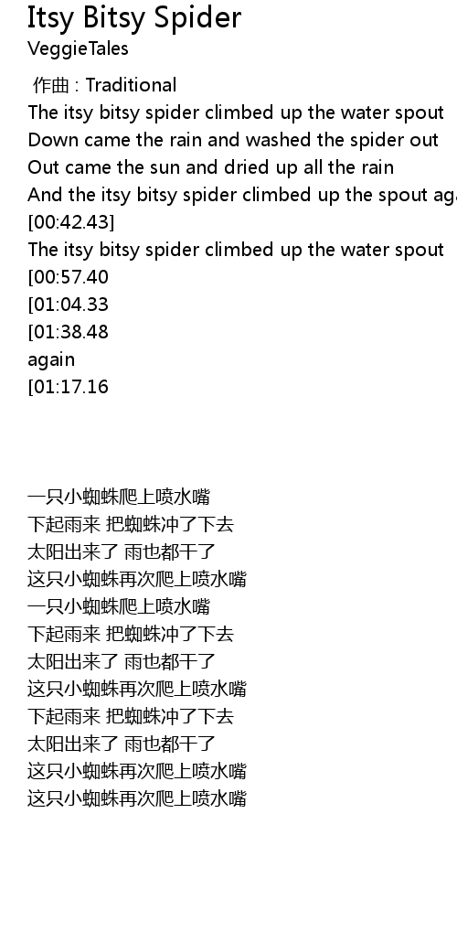 | [00:36.20] | And the itsy bitsy spider climbed up the spout again |