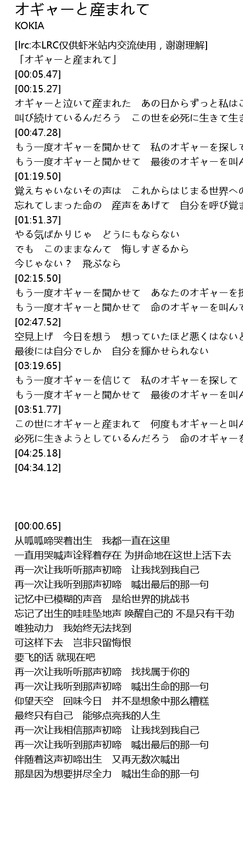 | [00:16.45] | オギャーと泣いて産まれた あの日からずっと私はここに居ると |