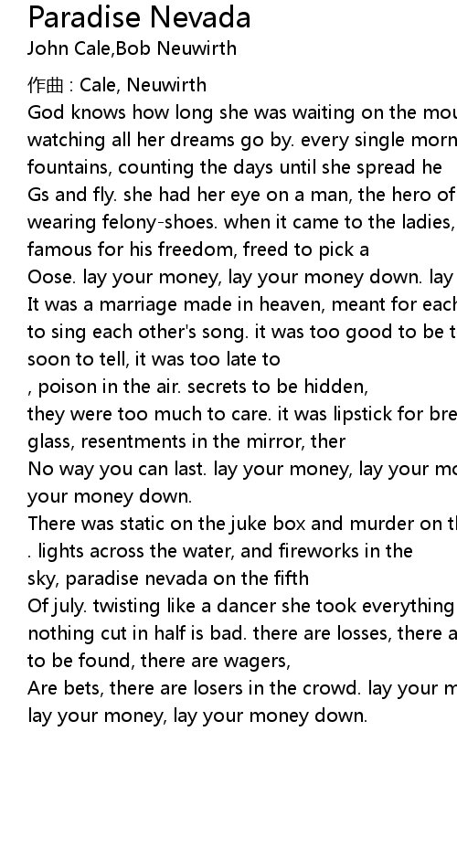 | There was static on the juke box and murder on their minds, money on the table, there were [walls left to climb]. lights across the water, and fireworks in the sky, paradise nevada on the fifth | |