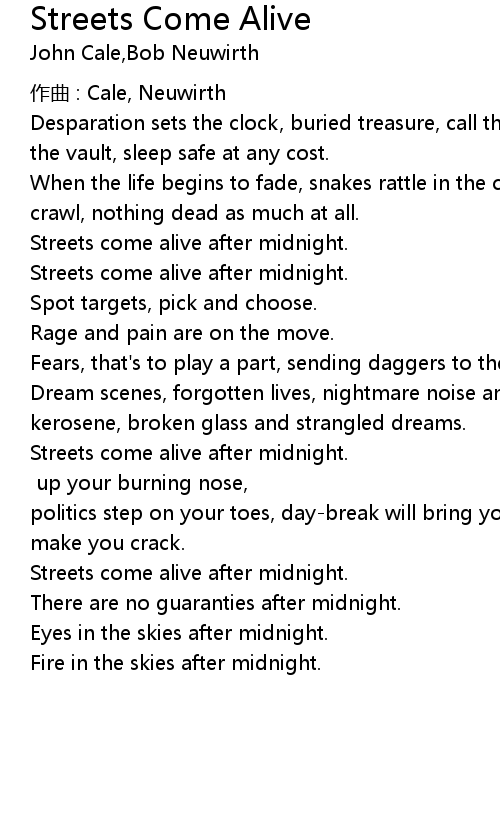 | Streets come alive after midnight. Blocked Splashed up your burning nose, politics step on your toes, daybreak will bring you back, bright lights will make you crack. | |