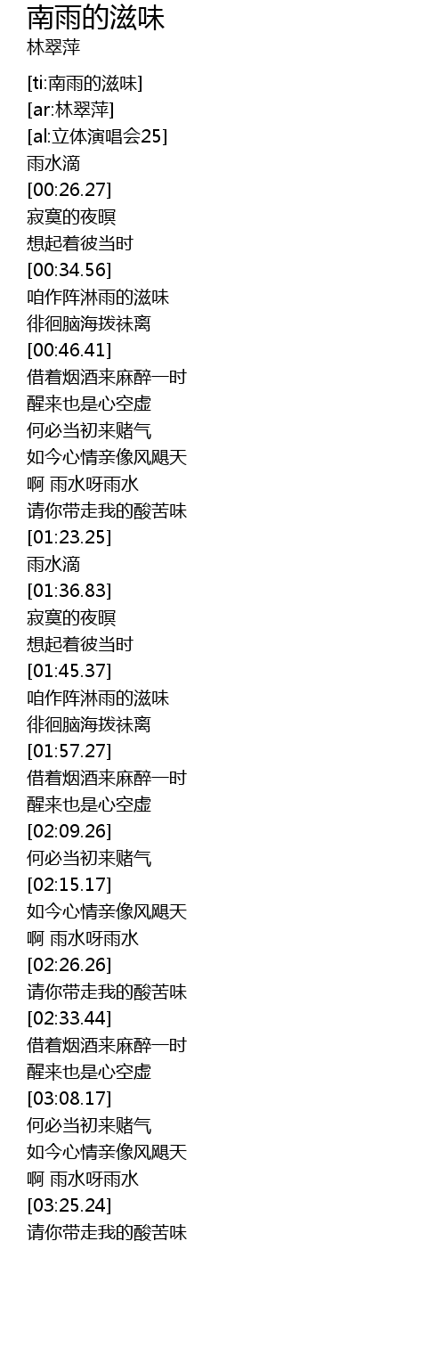 | [03:25.84] | qǐng nǐ dài zǒu wǒ de suān kǔ wèi |
