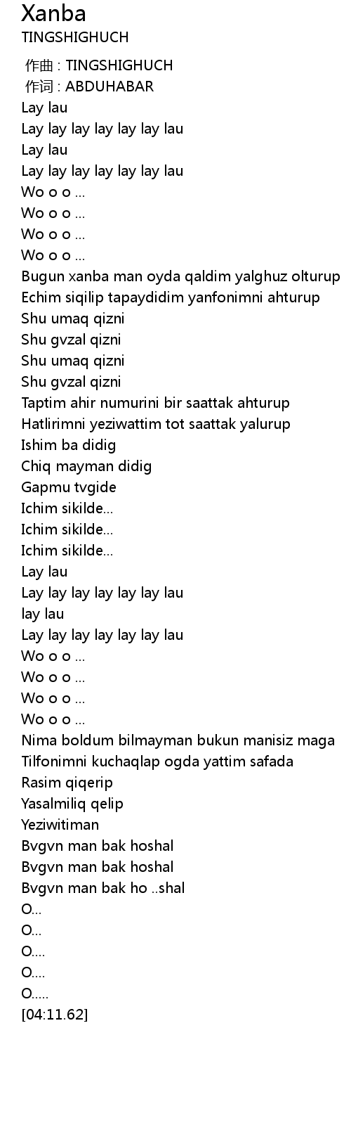 | [00:53.76] | Bugun xanba man oyda qaldim yalghuz olturup |