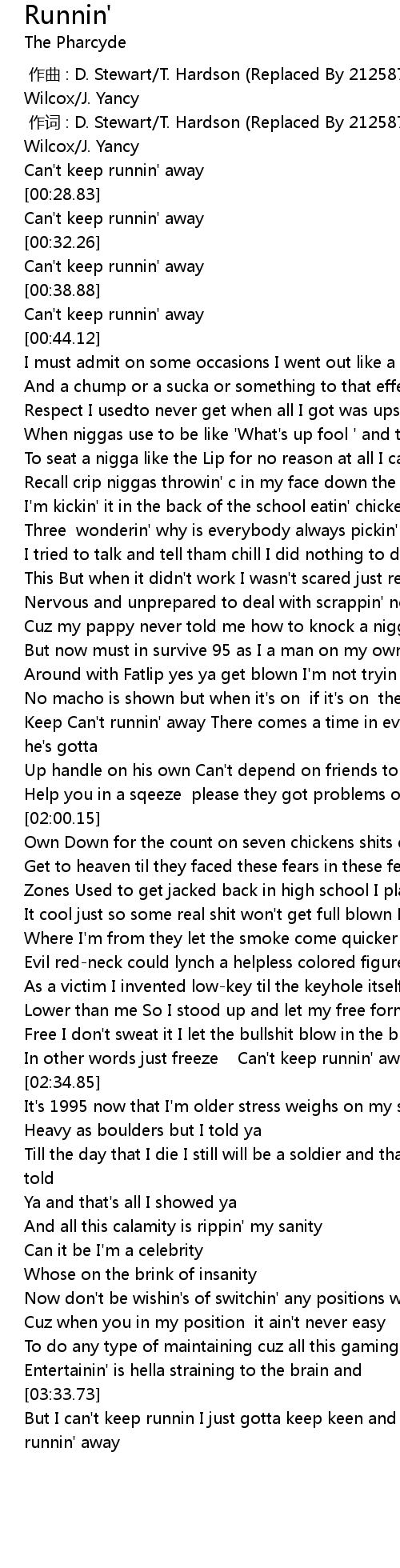 | [03:34.31] | But I can' t keep runnin I just gotta keep keen and cunnin' Can' t keep runnin' away |