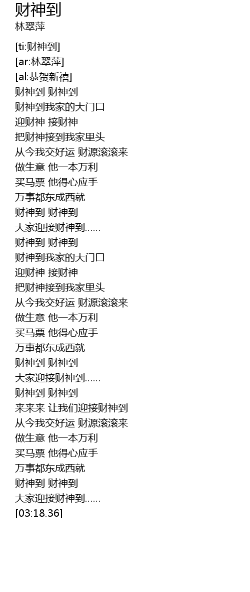 | [02:58.78] | 财神到 财神到 |