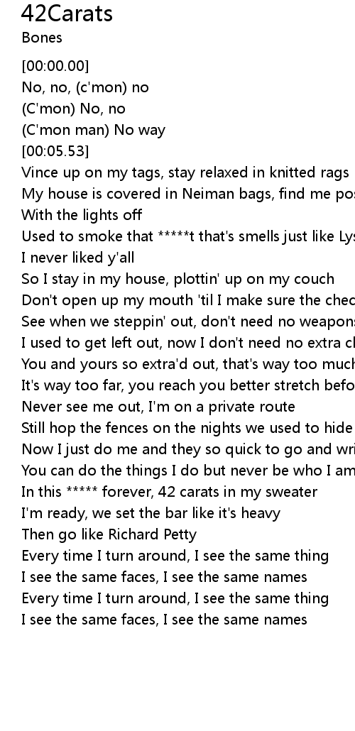 | [01:10.21] | In this ***** forever, 42 carats in my sweater |