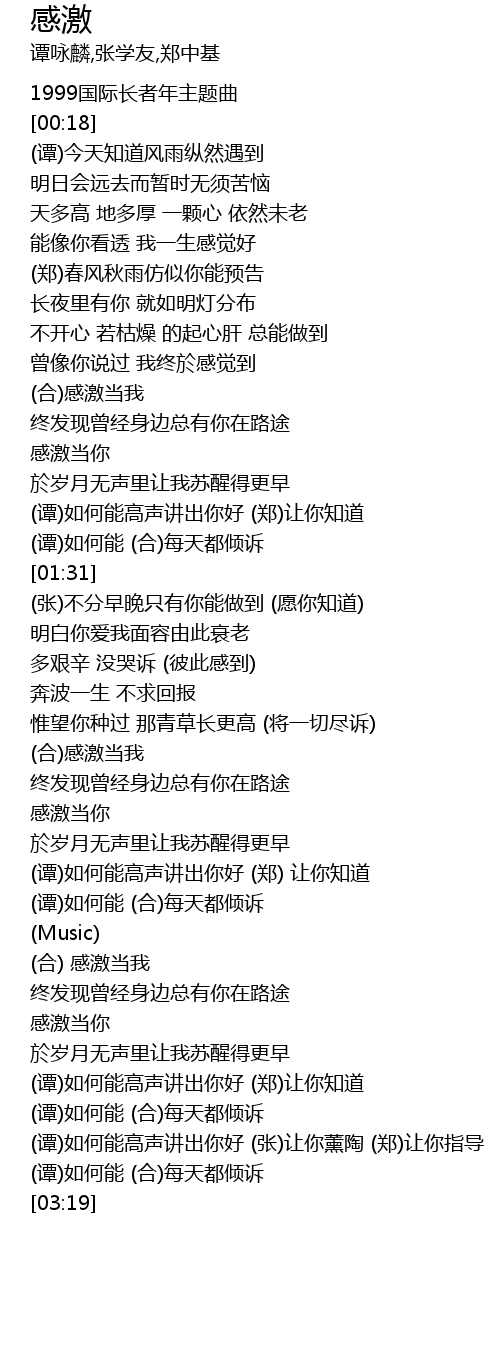 | [01:19] | (谭)如何能高声讲出你好 (郑)让你知道 |