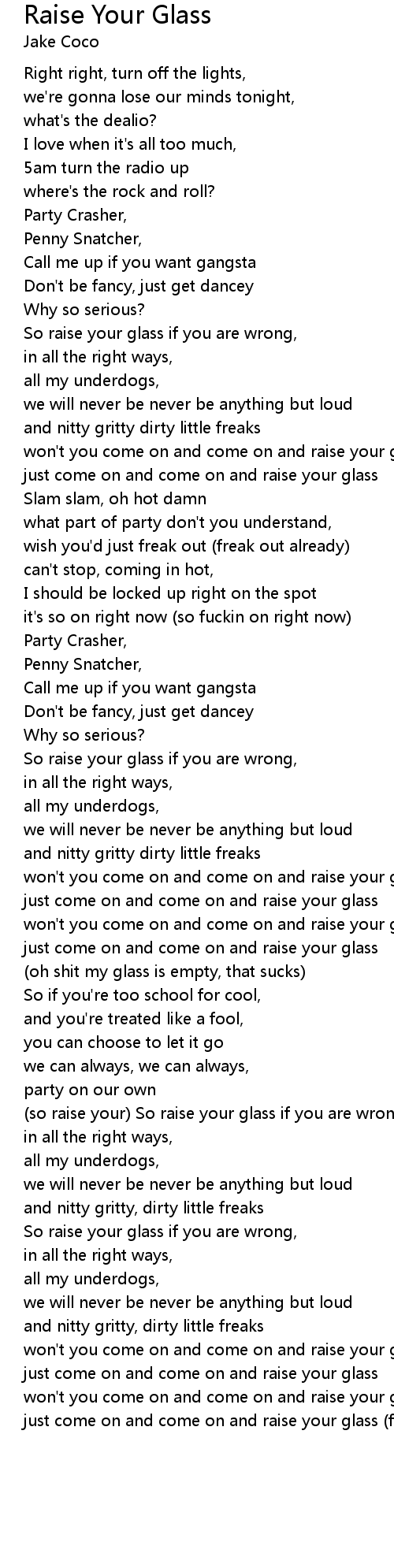 just come on and come on and raise your glass (for me) |