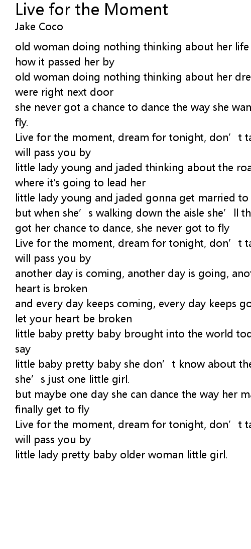 | Live for the moment, dream for tonight, don' t take it for granted or this life will pass you by | |