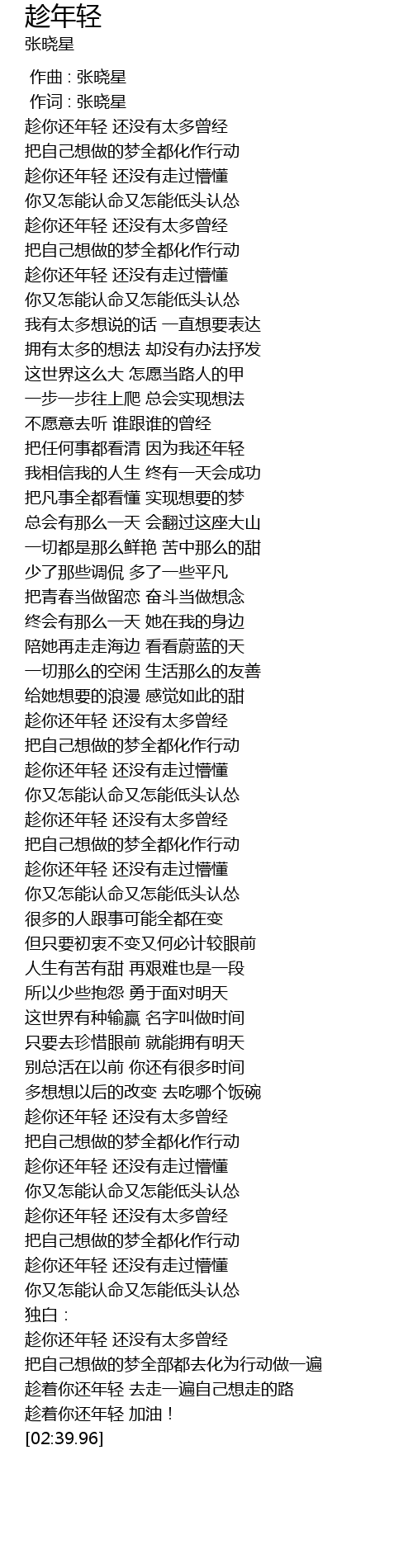 | [02:37.36] | chèn zhe nǐ hái nián qīng jiā yóu! |