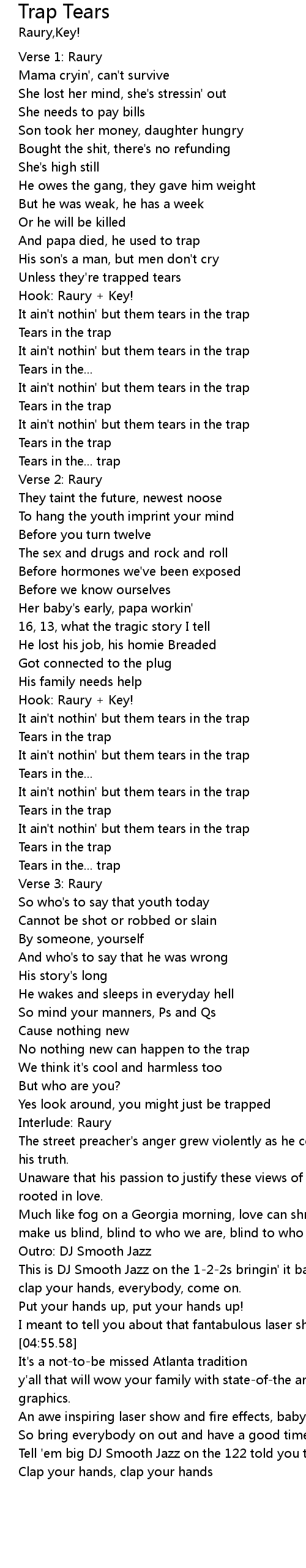 | [02:22.42] | It ain't nothin' but them tears in the trap |