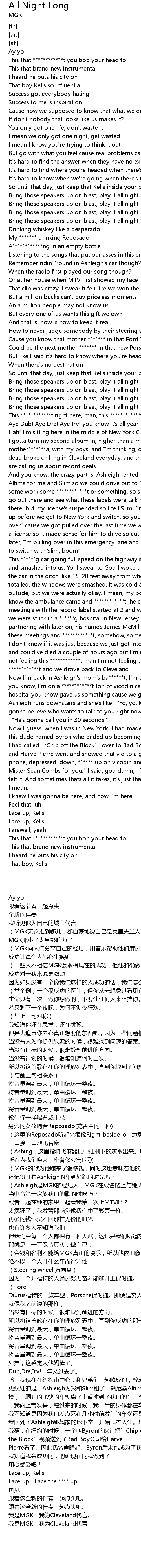| [05:12.00] | Now I'm back in Ashleigh's mom's ba******t, I'm thinking about life, you know, I'm on a ************t ton of vicodin cause the doctors at the hospital you know gave us something cause we got into that car accident and Ashleigh runs downstairs and she's like “Yo, yo, Kells, Kells, you're not gonna believe who wants to talk to you right now." I'm like, "who?” She's like “He's gonna call you in 30 seconds." |