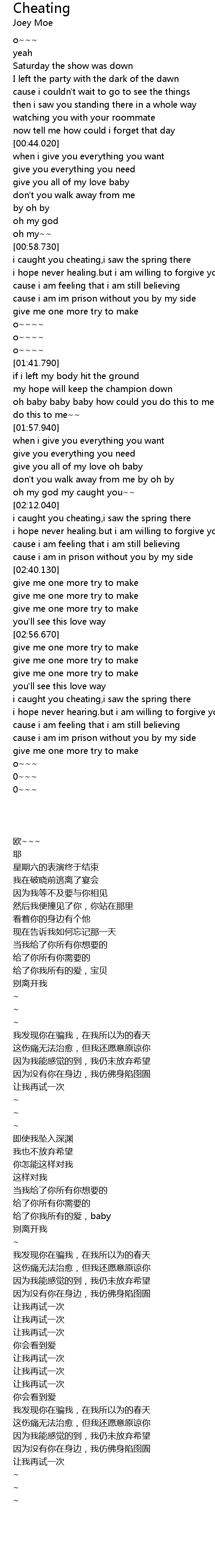 | [00:59.080] | i caught you cheating,i saw the spring there |
