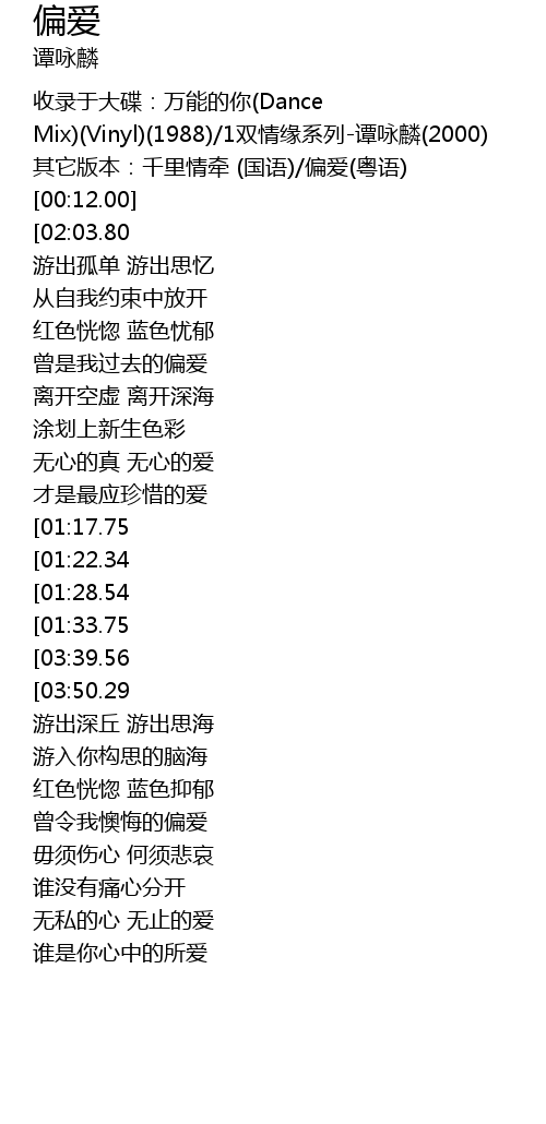 | [00:10.00] | 其它版本:千里情牵 (国语)/偏爱(粤语) |