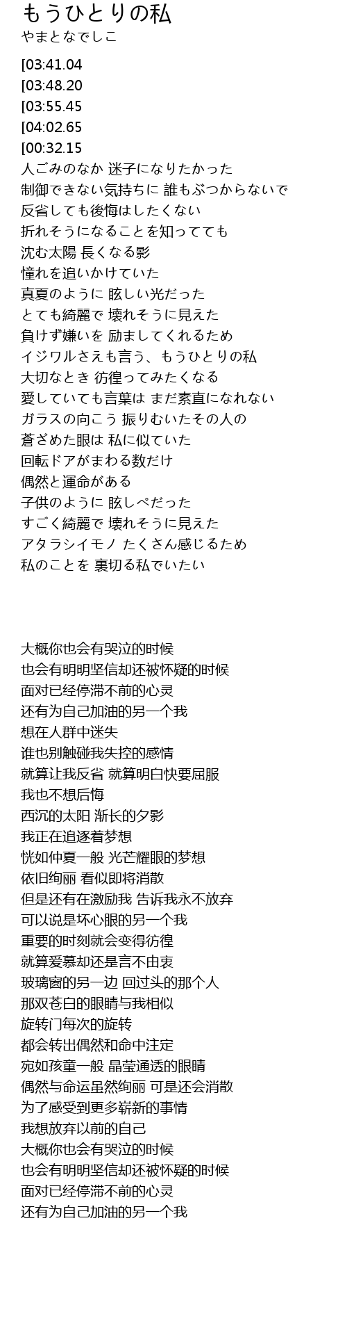 | [00:23.08][04:02.65] | ゲンキダシテと 言う、もうひとりの私 |