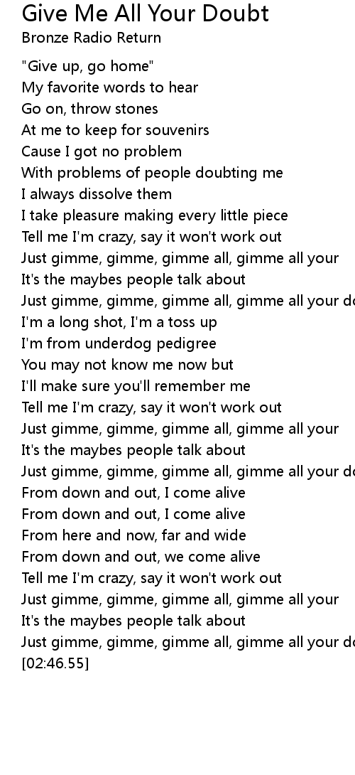 Just gimme, gimme, gimme all, gimme all your doubt |