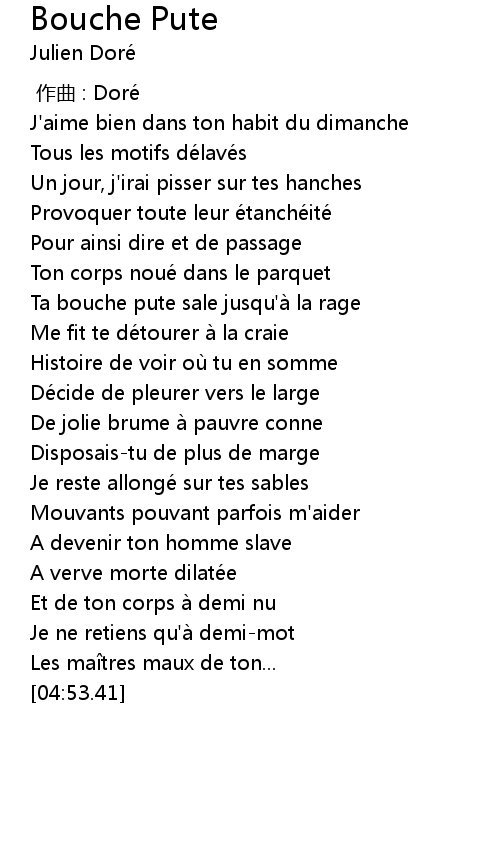 | [00:56.14] | Ta bouche pute sale jusqu'a la rage |