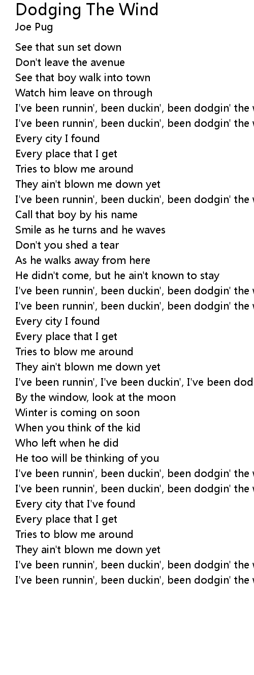 I've been runnin', I've been duckin', I've been dodgin' the wind |