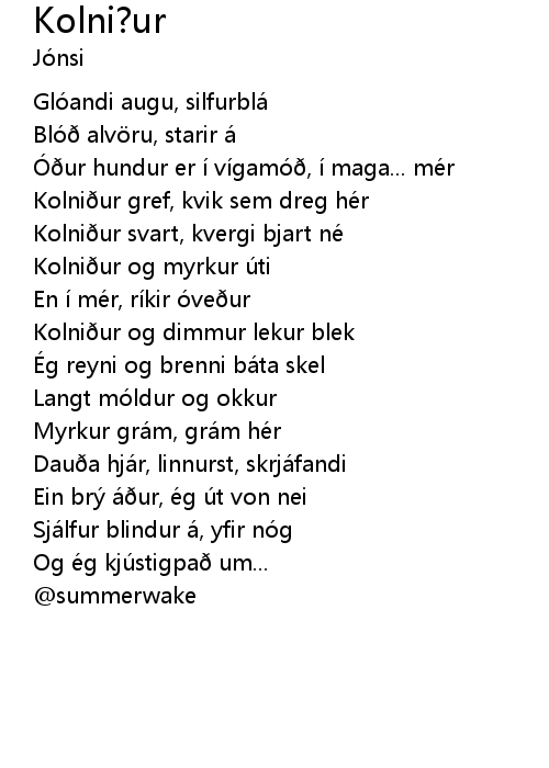 | [01:31] | Kolni ur svart, kvergi bjart ne |