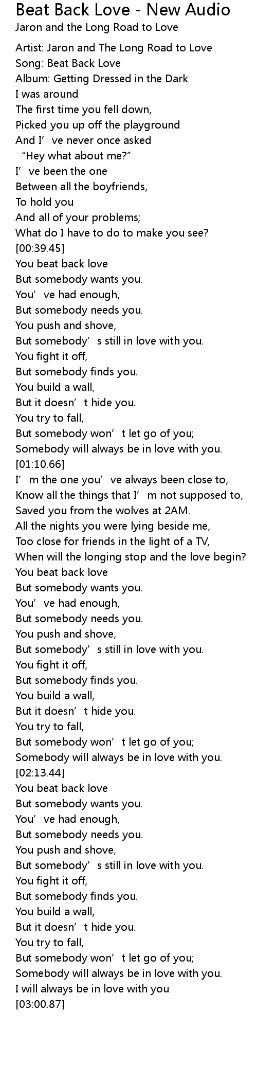 | [00:01.16] | Artist: Jaron and The Long Road to Love |