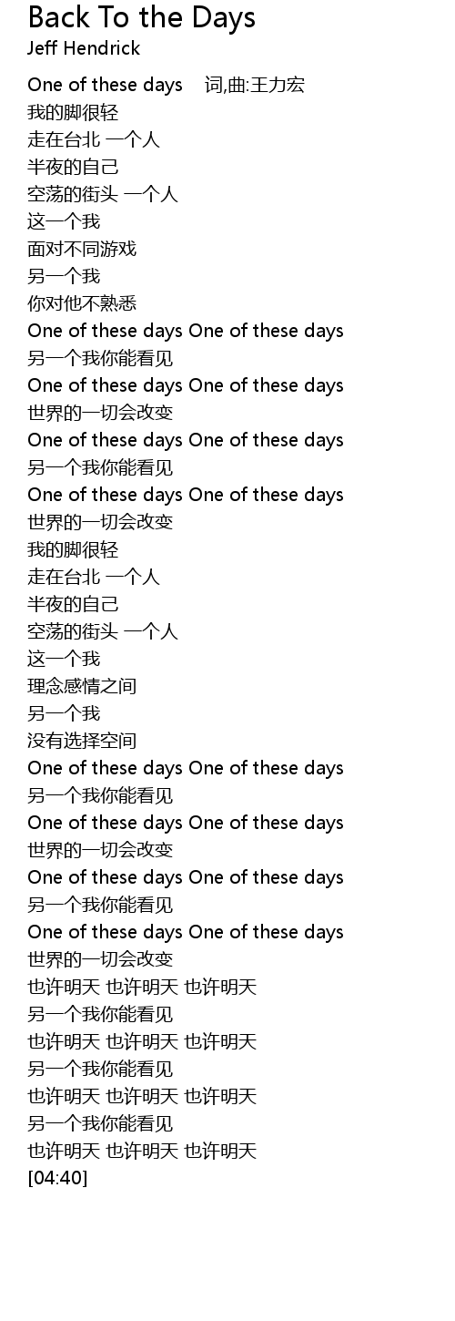 | [00:00] | One of these days 词,曲:王力宏 |