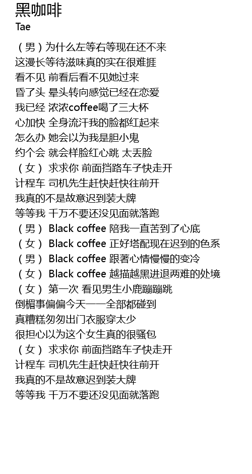 | [02:38.879] | nǚ Black coffee zhèng hǎo tǎ pèi xiàn zài chí dào de sè xì |