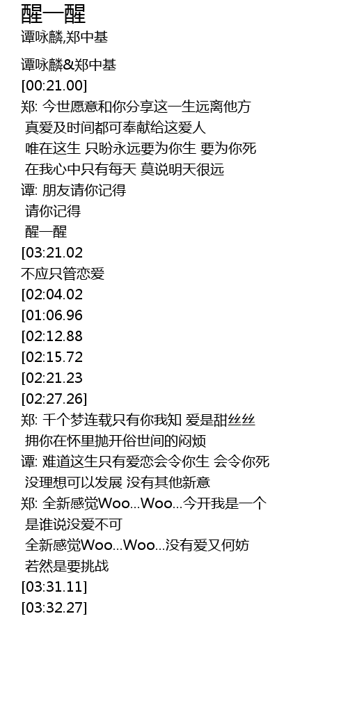 | [03:24.03][03:21.02][03:18.20][02:54.36][02:01.14][00:58.91] | xǐng yī xǐng bù yīng zhǐ guǎn liàn ài |