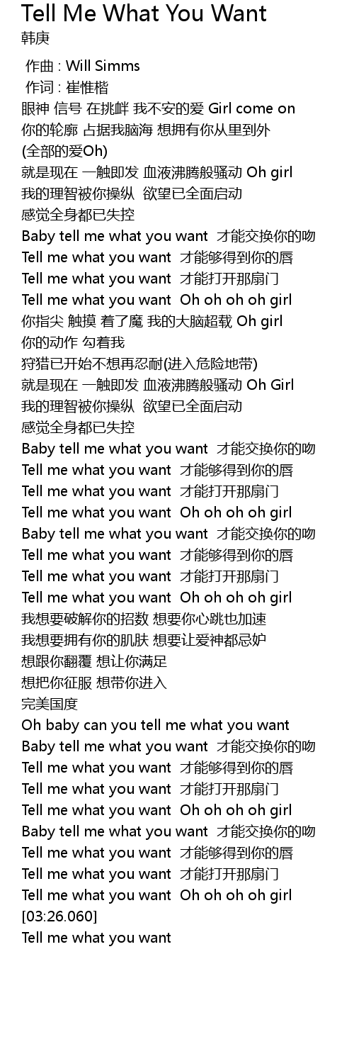 | [03:20.750] | Tell me what you want Oh oh oh oh girl |