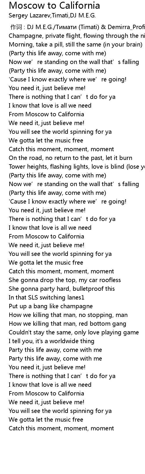 | [00:00.00] | 作词 : DJ M.E.G./Тимати (Timati) & Demirra_Profit |