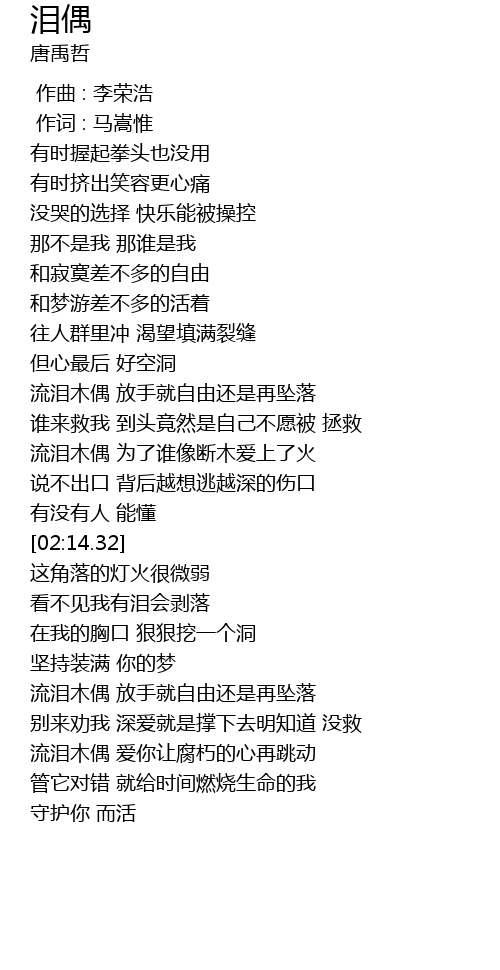 | [03:04.69] | 流泪木偶 放手就自由还是再坠落 |