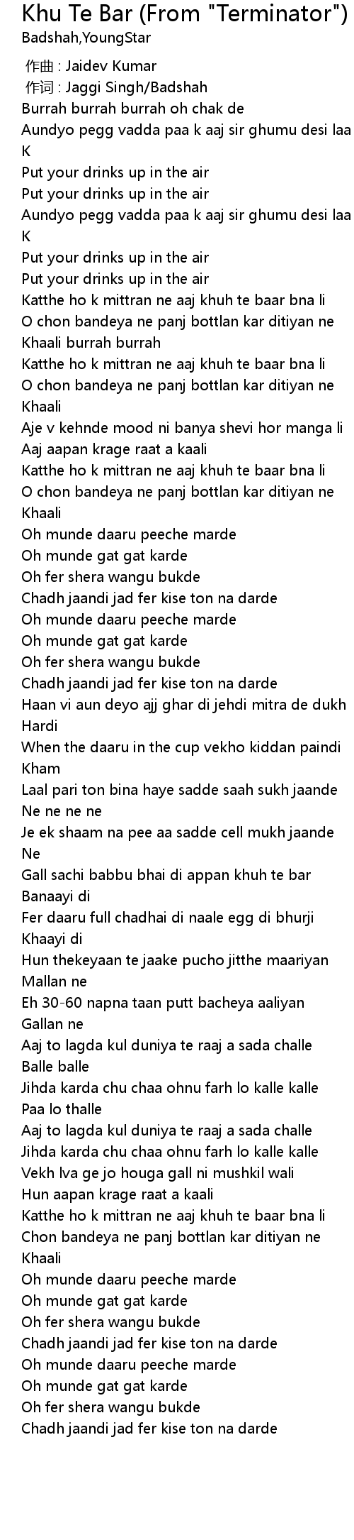 | [00:01.00] | 作词 : Jaggi Singh/Badshah |