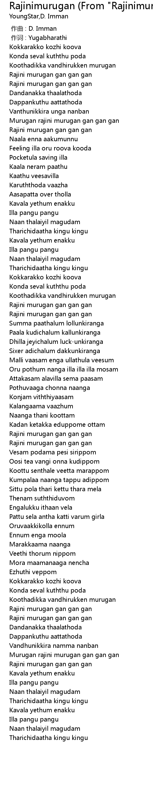 | [04:11.68] | Murugan rajini murugan gan gan gan |