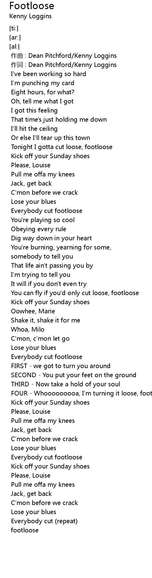 | [01:23.15] | Everybody cut footloose |