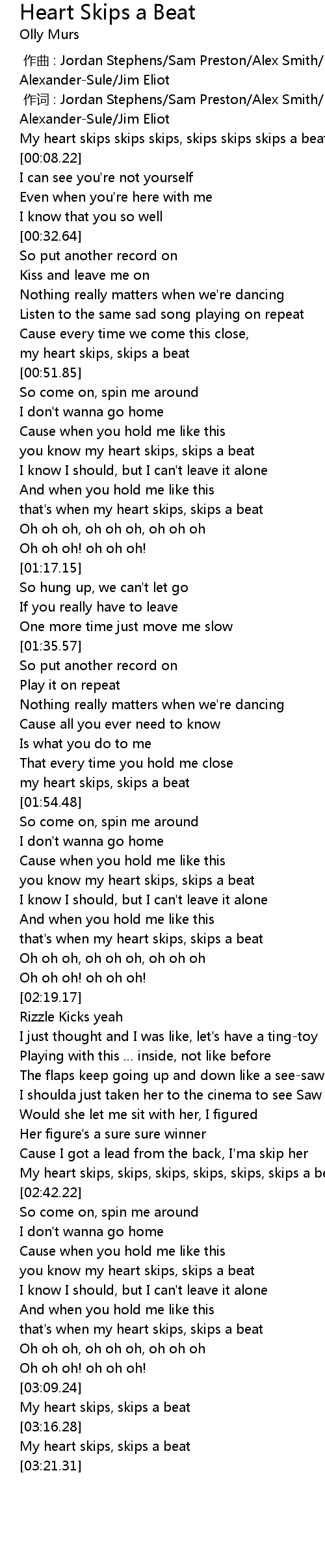| [02:36.98] | My heart skips, skips, skips, skips, skips, skips a beat |