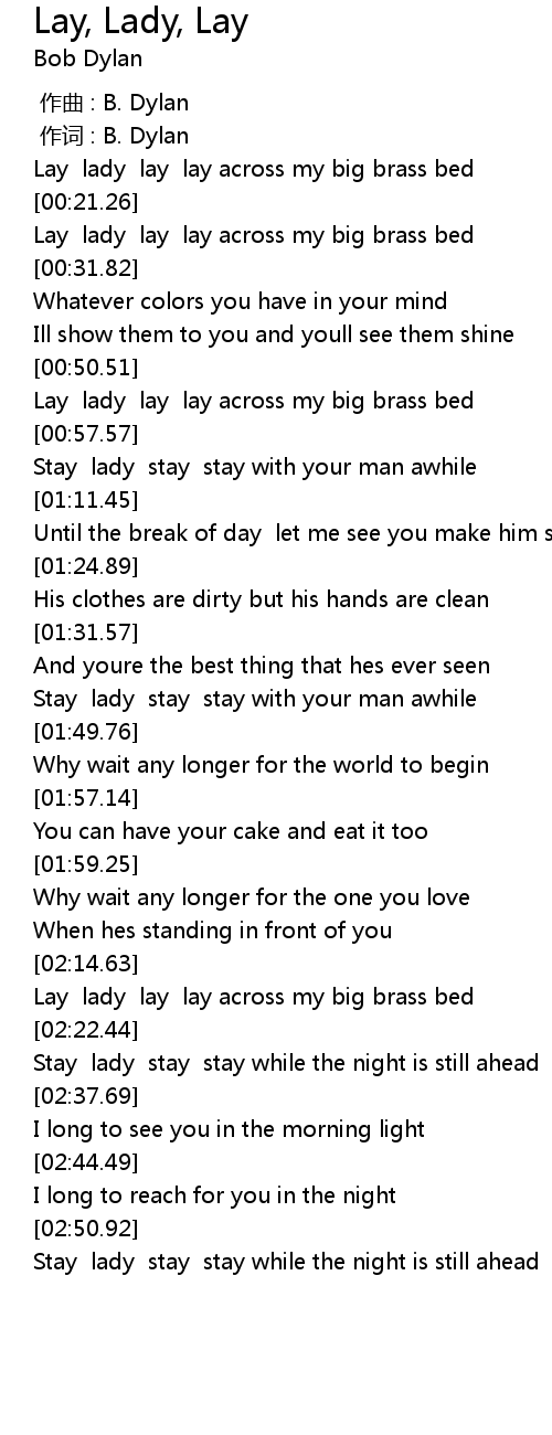| [00:51.14] | Lay lady lay lay across my big brass bed |