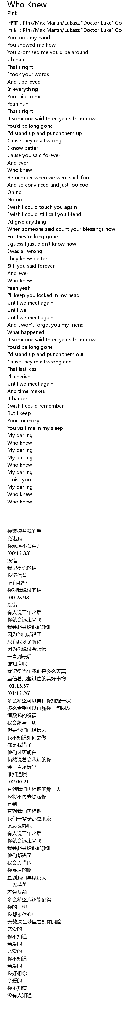 | [00:01.00] | 作词 : P!nk/Max Martin/Lukasz "Doctor Luke" Gottwald |