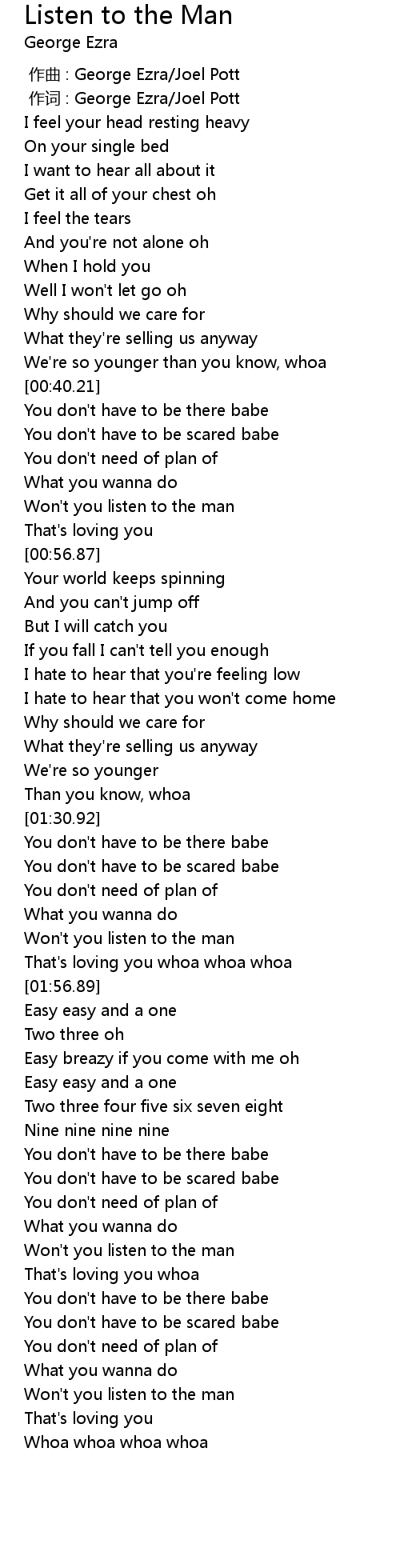 | [00:01.00] | 作词 : George Ezra/Joel Pott |