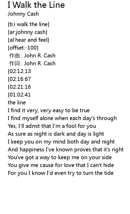 | [00:35.47][01:02.41][01:29.48][01:57.49][02:25.68] | Because you're mine, I walk the line |