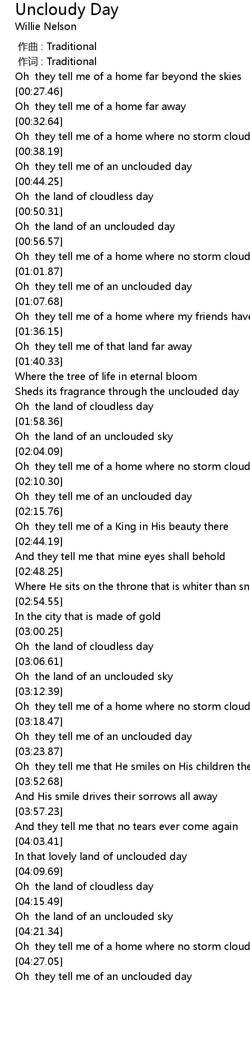 | [04:28.17] | Oh they tell me of an unclouded day |