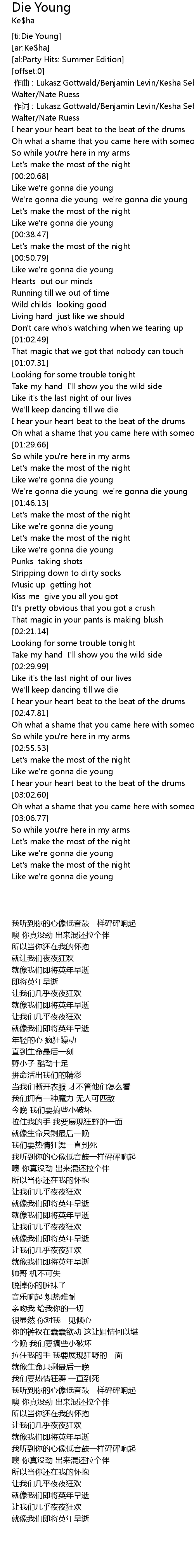 | [00:01.00] | 作词 : Lukasz Gottwald/Benjamin Levin/Kesha Sebert/Henry Walter/Nate Ruess |