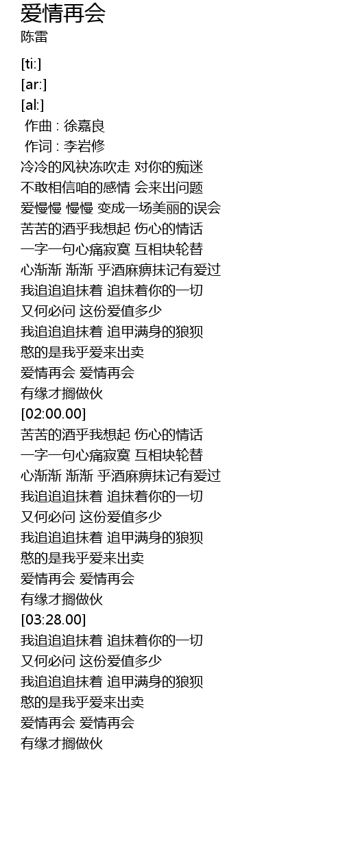 | [01:44.00] | ai qing zai hui ai qing zai hui |
