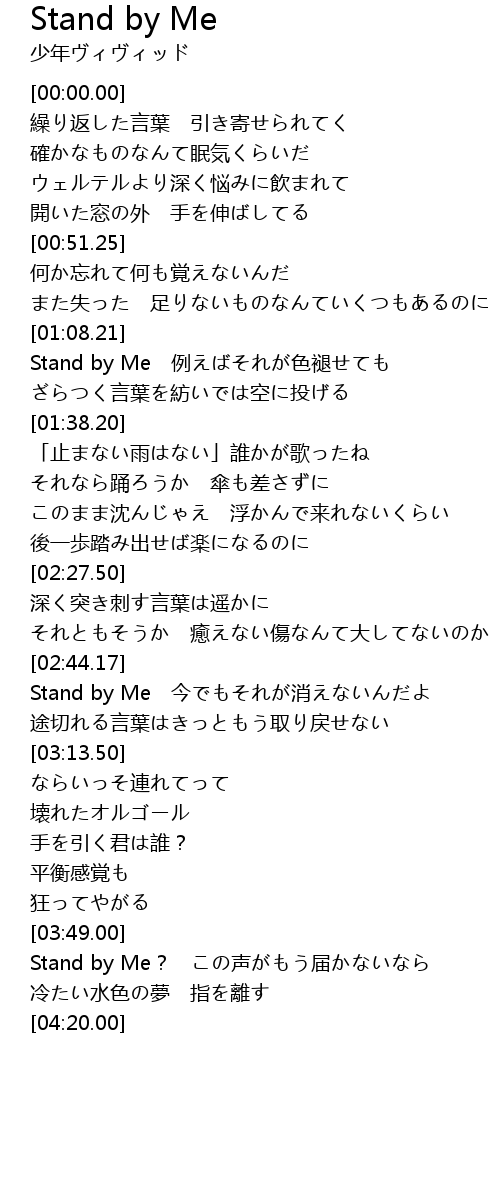 | [02:47.17] | Stand by Me 今でもそれが消えないんだよ |