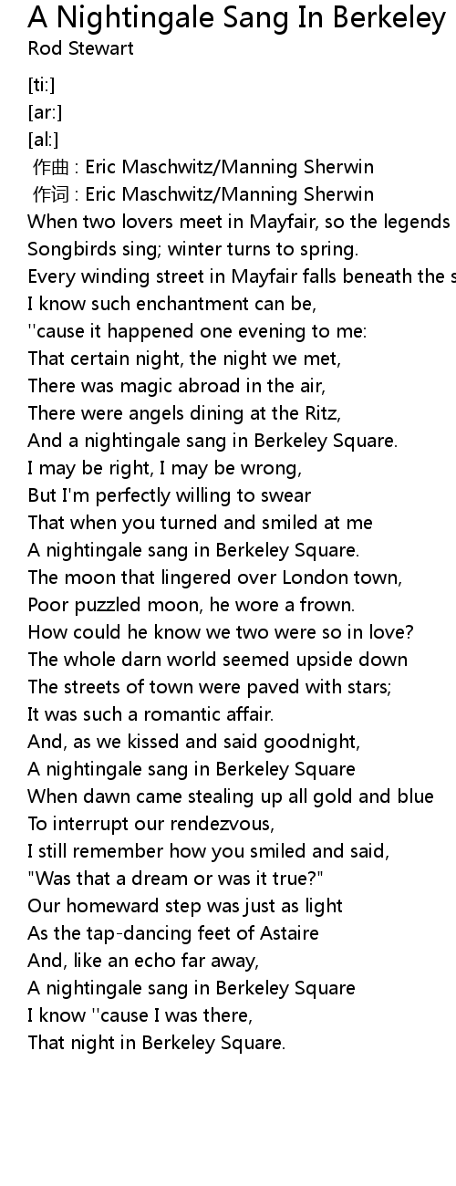 | [01:21.70] | A nightingale sang in Berkeley Square. |