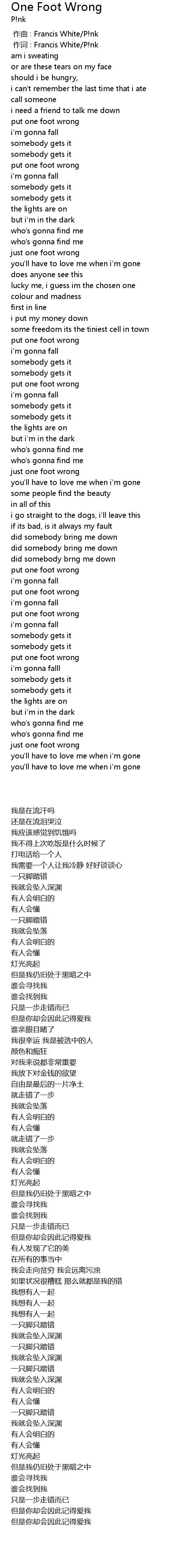 | [00:01.00] | 作词 : Francis White/P!nk |