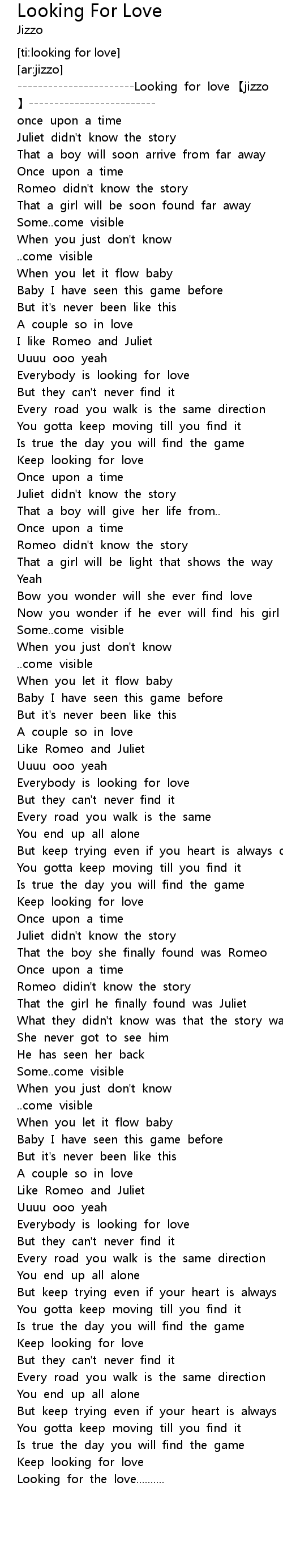 | [00:01.76] | -----------------------Looking for love 【jizzo 】------------------------- |