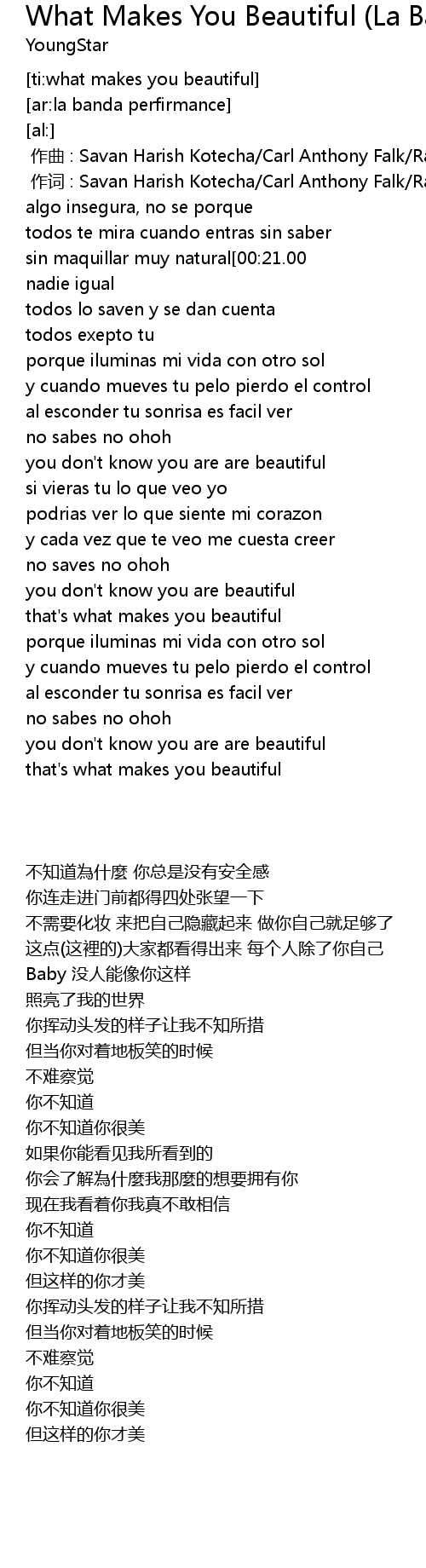 | [01:024.00] | you don' t know you are are beautiful |